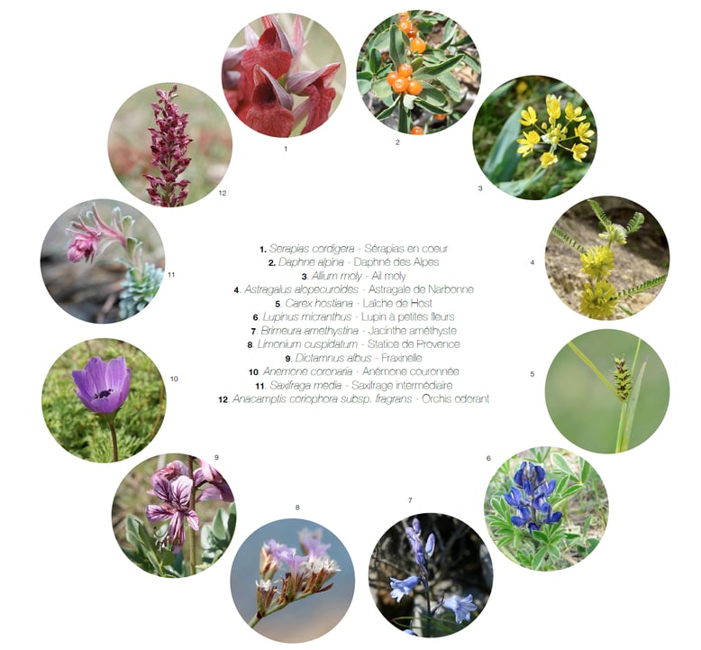L'image ci-dessous vous propose un échantillon chromatique de ces espèces patrimoniales et nous vous invitons à parcourir le site de l'atlas pour découvrir toutes les autres merveilles floristiques qui se cachent dans l'Aude...